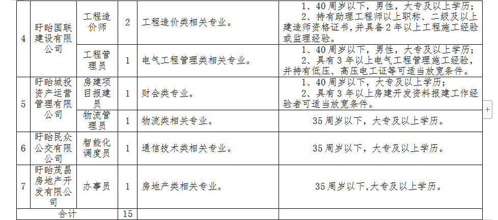 因業(yè)務(wù)發(fā)展需要,盱眙國有聯(lián)合資產(chǎn)經(jīng)營集團(tuán)有限公司決定面向社會公開招聘工作人員15名。 一、招聘崗位及條件 本次招聘具體崗位及條件詳見《盱眙國有聯(lián)合資產(chǎn)經(jīng)營集團(tuán)有限公司公
